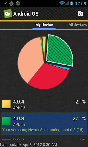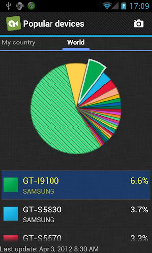 O objetivo Anfish é fornecer aos usuários interessantes dados estatísticos relacionados aos seus dispositivos Android. Uma das informações mais solicitado é a popularidade (em porcentagem) da versão do sistema operacional do dispositivo do usuário entre todos os dispositivos Android em qualquer her / seu país, algum outro país, ou o mundo inteiro. A informação será mostrada com gráficos de pizza extravagantes.