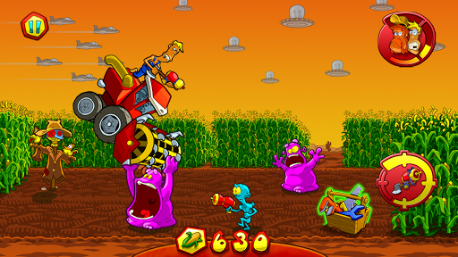 Farm Invasion USA, faça sua colheita e a mesmo tempo, aniquila todos os ets de sua plantação e colete todos os objetos pelos caminhos, ótimos gráficos e ótima jogabilidade